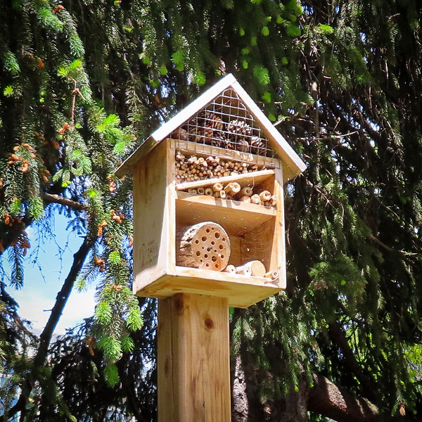 Lors de votre prochaine randonnée dans les Jardins des Floralies, il sera possible d'apercevoir des hôtels à insectes. Ces petites maisons de cèdre peuvent accueillir de nombreux insectes, dont des abeilles solitaires, aussi appelées abeilles sauvages, charpentières ou maçonnes, qui sont d'importantes pollinisatrices. Elles sont les premières à polliniser les fleurs et les fruits au printemps. On en compte plus de 350 variétés au Québec.